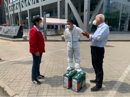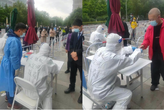 5月19日,,,,,北京分公司党支部书记、总司理刘玉忠前往向阳区开国门外大街永安里东社区通用国际时代中心核酸检测点,,,,,探望慰问北京分公司下沉社区一线支持疫情防控的党员干部王锐敏。。。。。。。